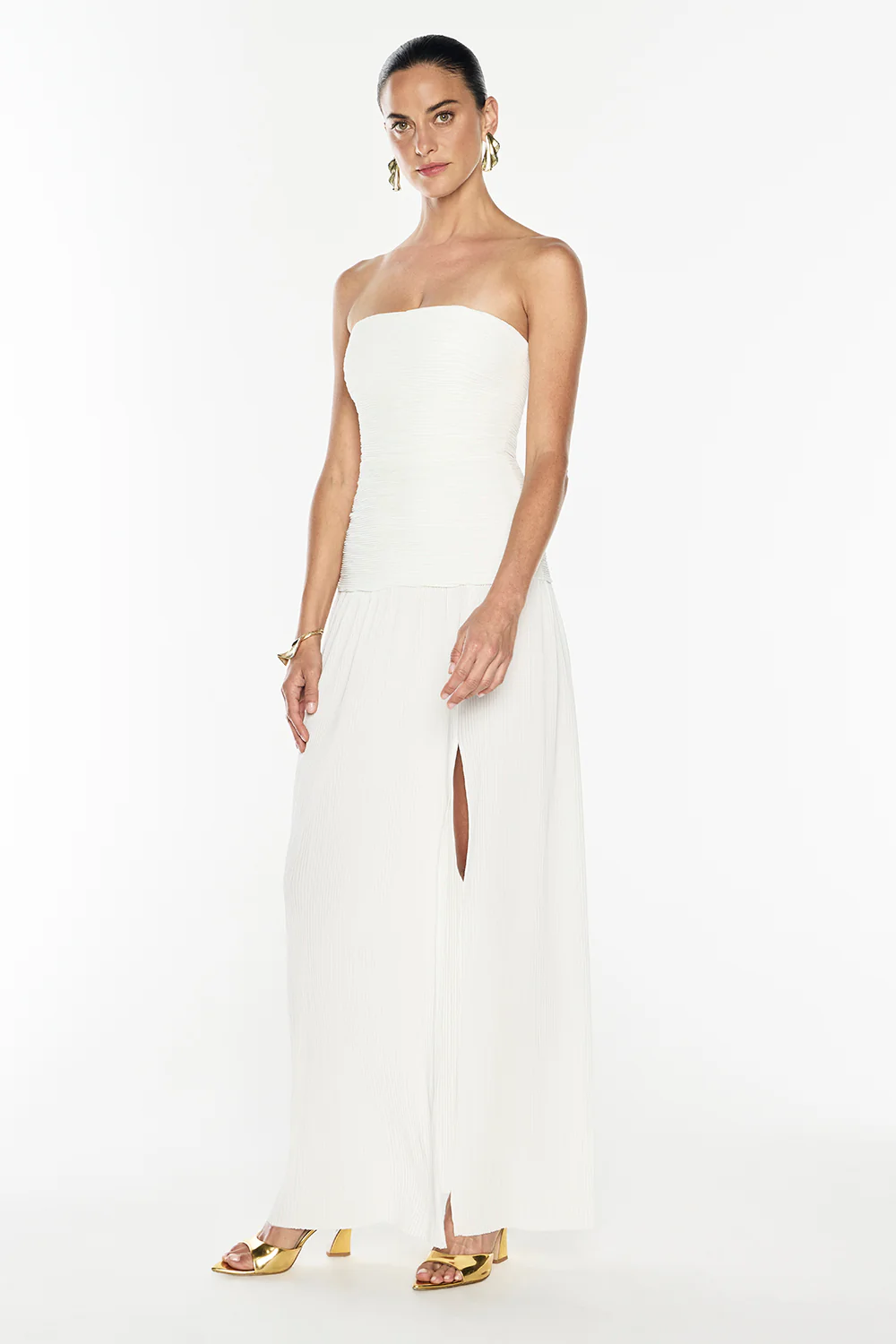 Turn heads at your next event with our chic Double Time Pleat Strapless Dress, a must-have for any stylish wardrobe. Featuring a sleek, strapless design with elegant pleats, this dress effortlessly transitions from a fitted bodice to a graceful maxi skirt. The subtle side split adds a touch of allure, making it perfect for any occasion.