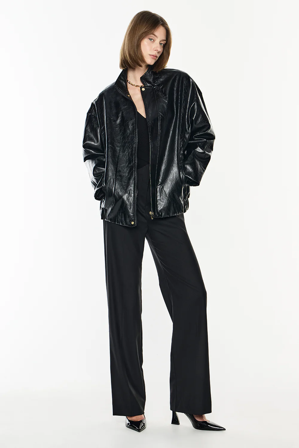 A modern update on the iconic bomber, crafted in textured vegan leather. The Love x Love Bomber features MC-branded press snaps at the front closure, an exposed zip, and a relaxed fit, making it perfect for effortless layering and versatile everyday styling.