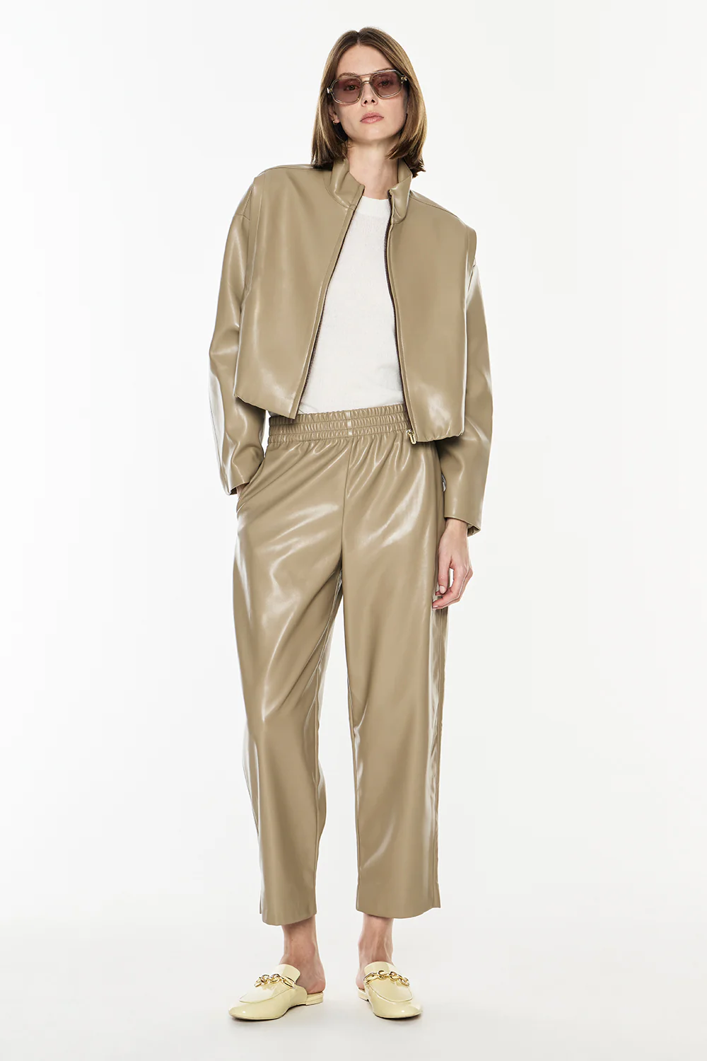 The Major Players Cropped Bomber in vegan leather features a high neck, elasticated hem, and exposed front zip closure. The pleat detailing at the shoulders and sides enhances the relaxed fit, offering effortless elevated style. Pair with the Major Players Pull-On Pant or Major Players Pant for a coordinated, polished look.
