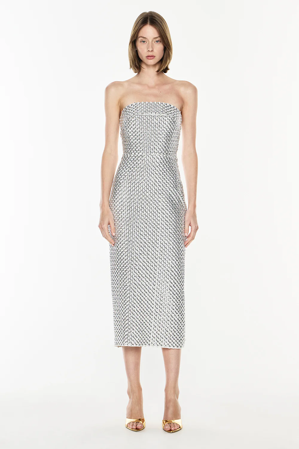 This strapless midi dress features silver spot sequin fabric that catches the light. With a boned bodice and fitted silhouette, it offers structured elegance, while a centre-back split ensures ease of movement. Designed to be worn with a strapless bra for a seamless finish.
