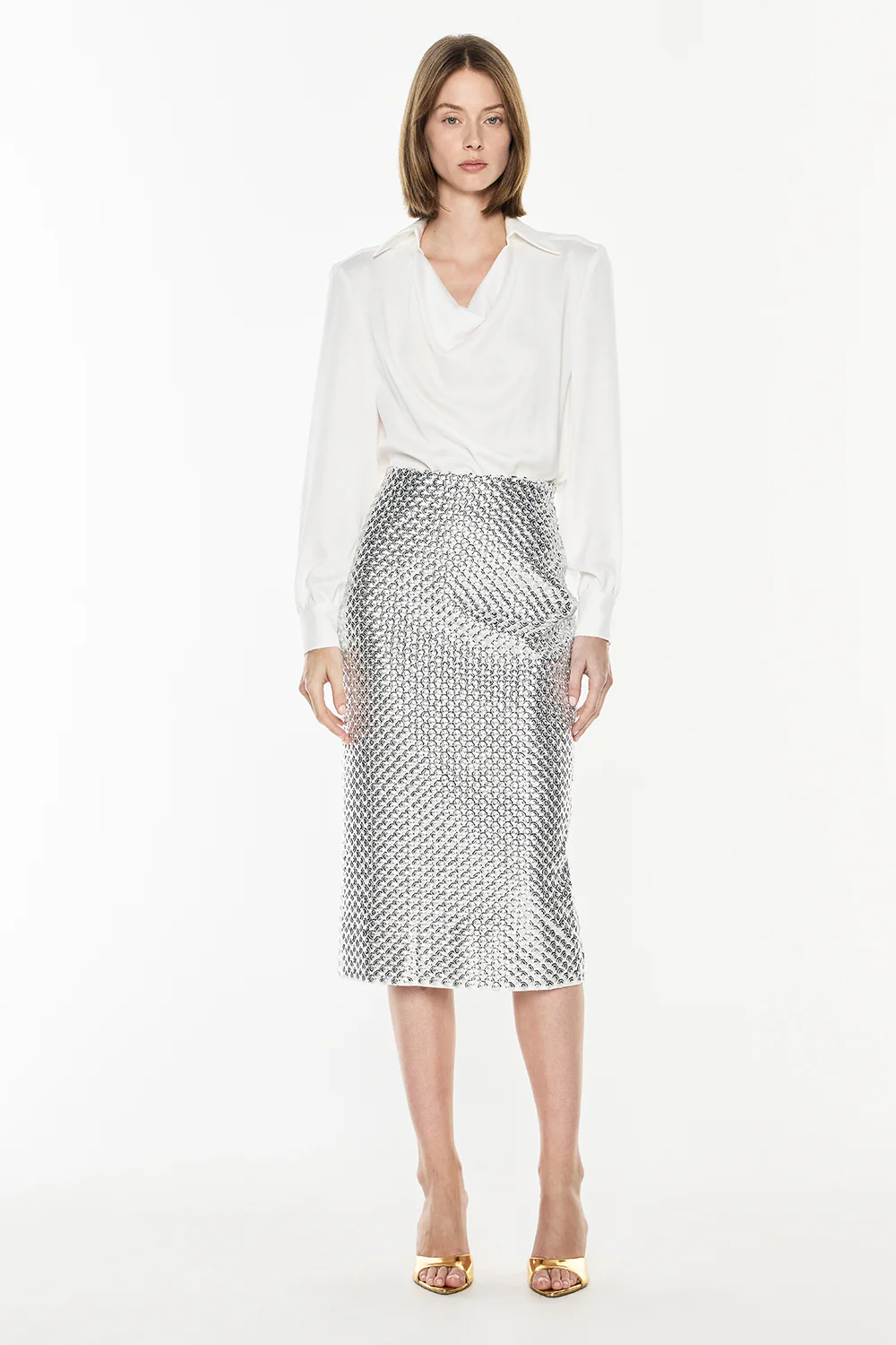 This cowl neck blouse features a collar, full-length cuffed sleeves, and MC silver bauble buttons at the cuffs, with a relaxed, bra-friendly fit. Crafted from satin with a subtle sheen, it offers effortless elegance for elevated day dressing or workwear. Pair with the Opulent Scale Skirt or Lady Grey Trousers for a polished, coordinated look.
