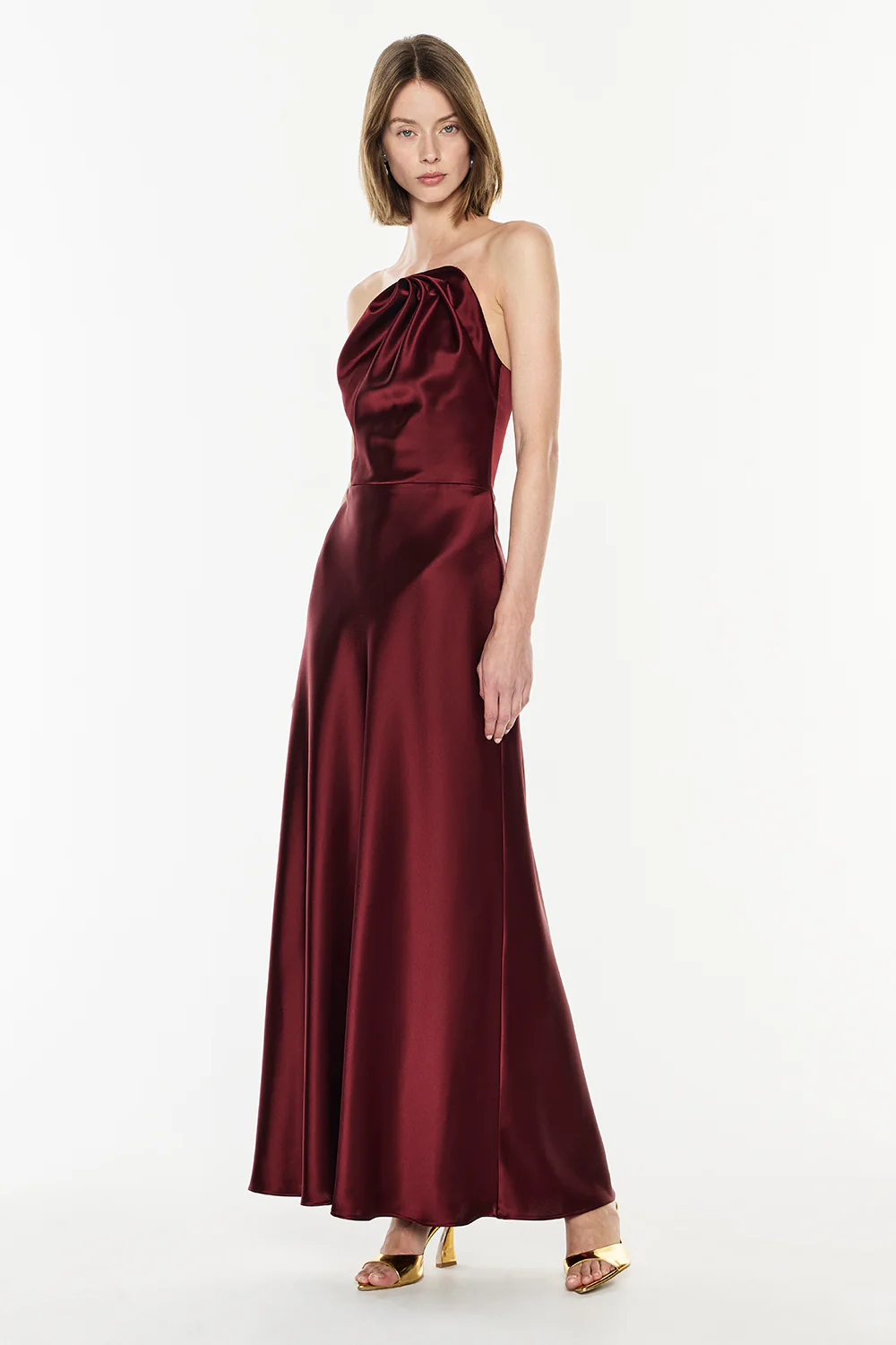 Turn heads in the Show Me Love Strapless Gown, designed for standout occasion dressing. Crafted from a luxurious satin-finish fabric, the bodice features striking, sculptural detailing that creates a bold yet refined look. Falling to a maxi length, the silhouette is balanced with a fitted bodice and softly flowing skirt for an effortlessly flattering finish.