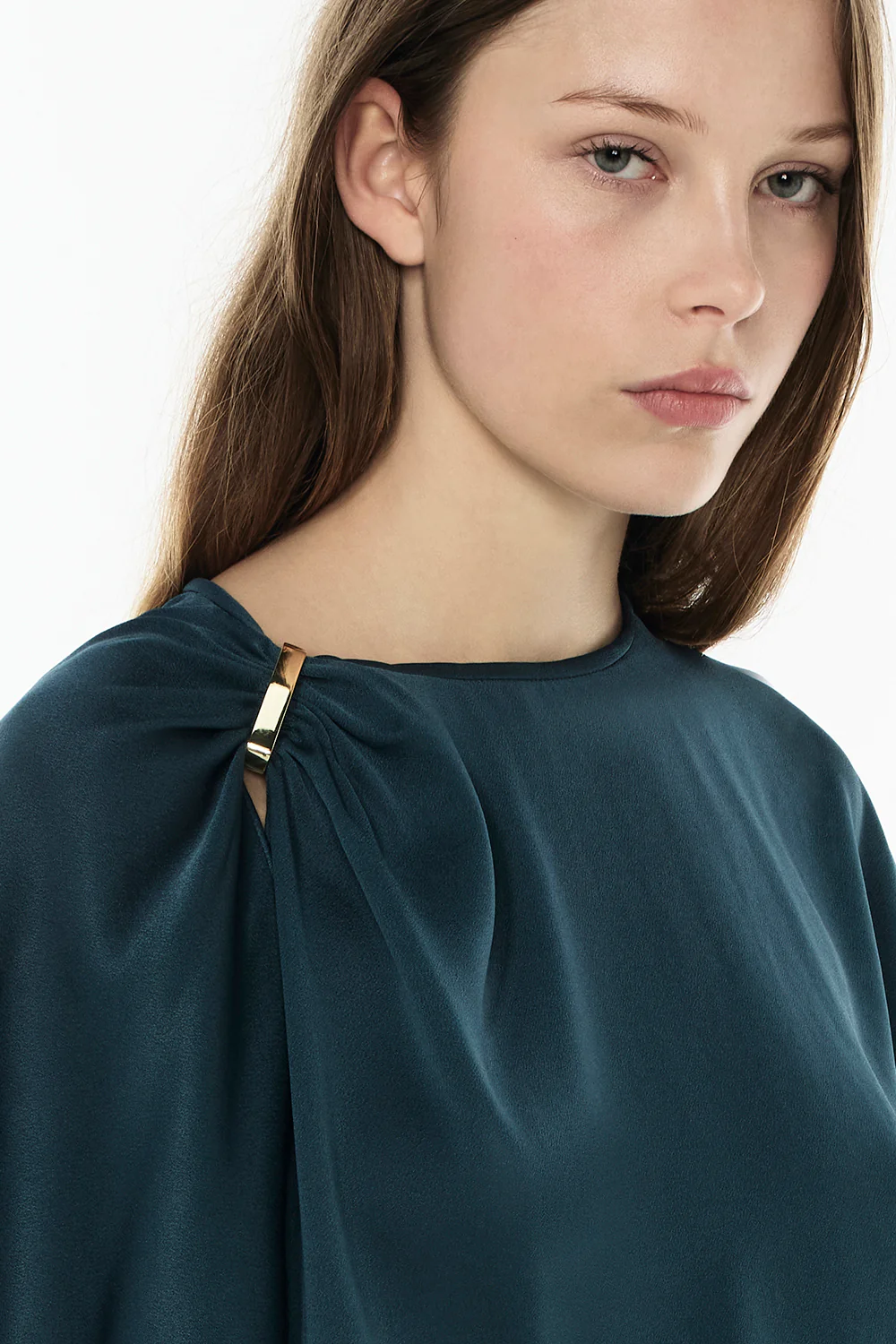 This relaxed-fit top blends modern tailoring with refined detailing. Crafted from satin with a subtle sheen, it features flowy short sleeves that skims the body. The wearerās right shoulder is gathered into a removable gold bar, adding a signature, statement touch. Designed for effortless day or evening styling, it balances structure and movement with understated elegance.